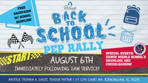 Find out more »Kids & parents get ready!! Join us next Sunday, August 6th following 2nd service for our Back To School Pep Rally! You don’t want to miss our special guest drumline, free school supplies, and more!